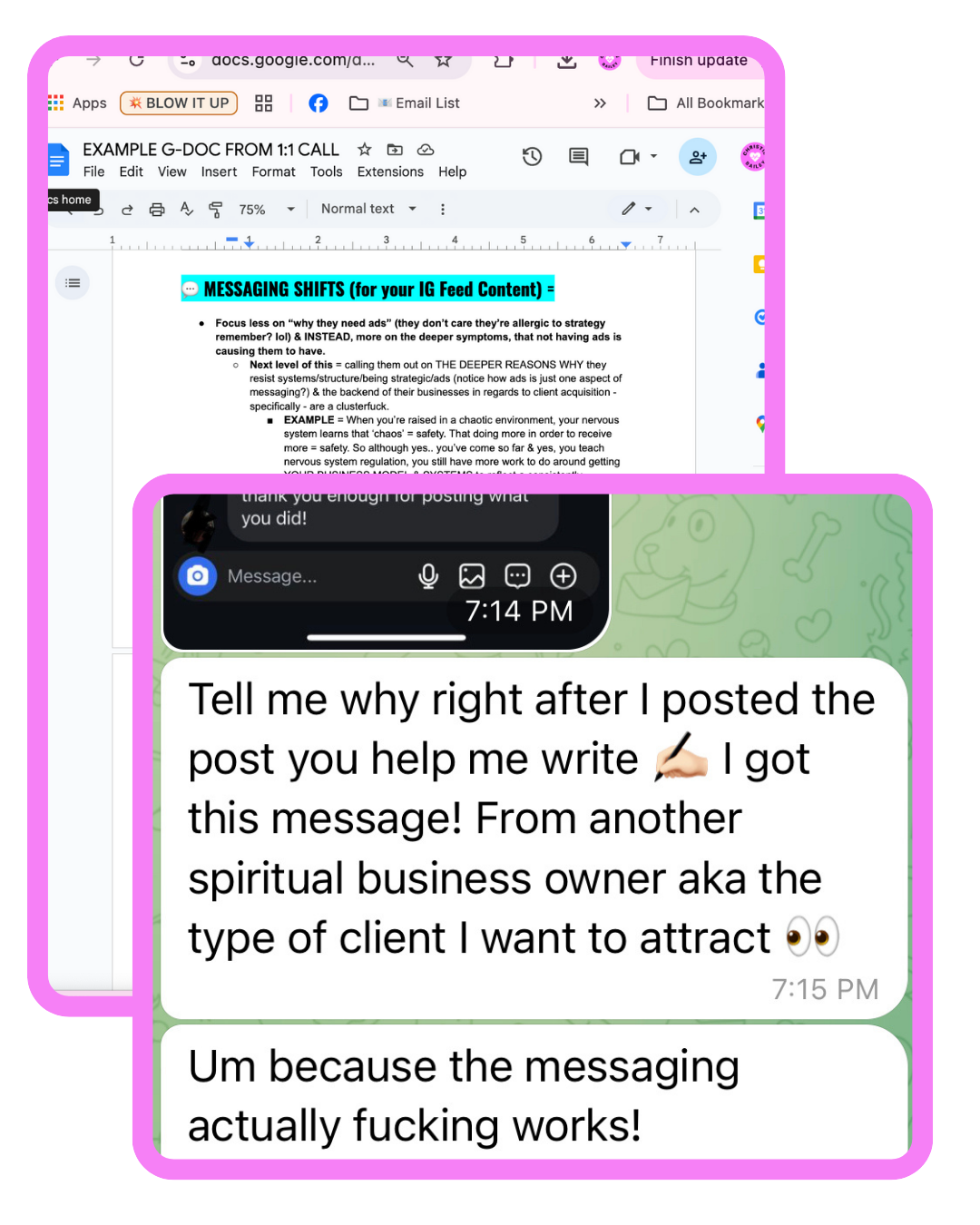 🔥 A total messaging makeover + a strategic list of content topics/hooks, to attract those higher-level clients you REALLY wanna be working with: ie. the women who are ALREADY successful + motivated, who ALREADY trust themselves, who are already taking action towards their dreams.. and are now ready to go even BIGGER.