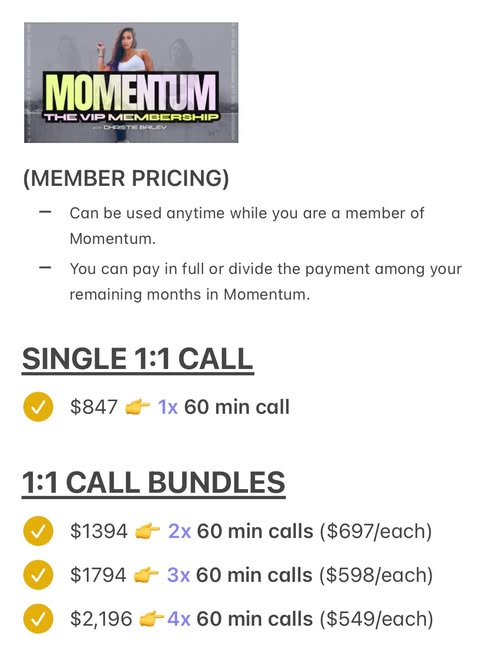 (Meaning; if you needed me to help you with your messaging in depth and go through it together like we did on our intensive β€” you book a 1:1 call for that. And members get special pricing on those.)